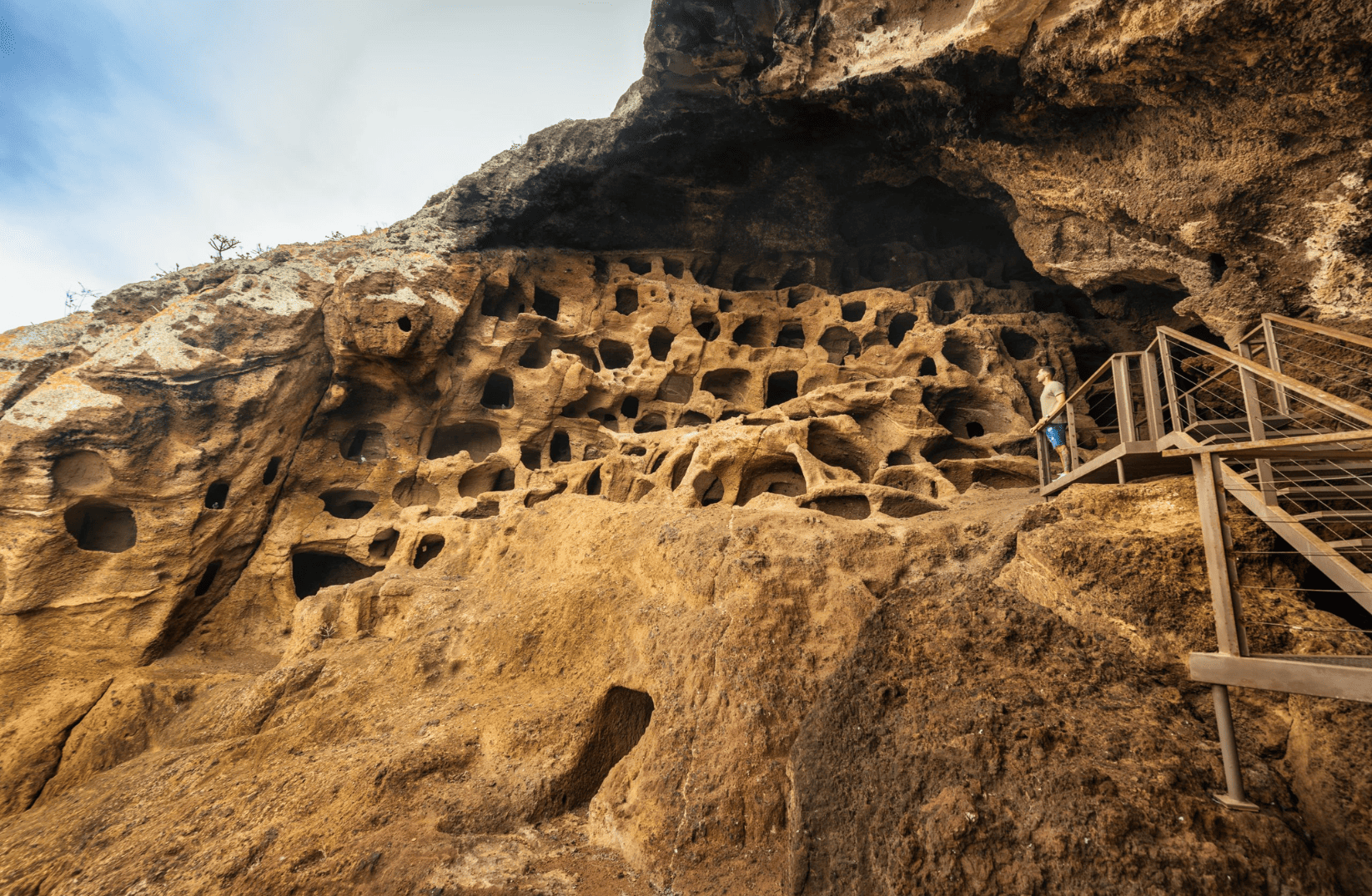 Aquí es donde la historia se pone divertida. Olvida los museos aburridos; el Cenobio de Valerón es un complejo arqueológico que parece sacado de una película de fantasía. Aunque el nombre suena a monasterio, en realidad era un granero comunitario gigante. Los antiguos aborígenes excavaron casi 300 cuevas o silos en la roca volcánica usando solo herramientas de madera y piedra. ¡Imagínate el trabajo!